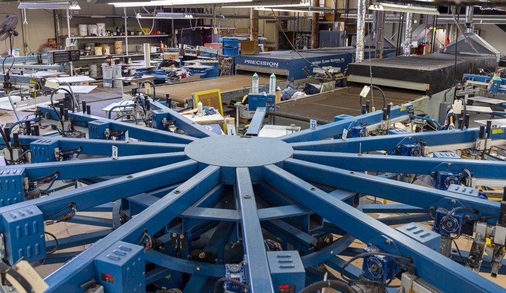 Our t-shirt printing facility consists 4 automatic printing machines, 3 manual print machines, screen making, digital art facility. It is supported by a sewing department and warehouse in a 40,000 square foot building.